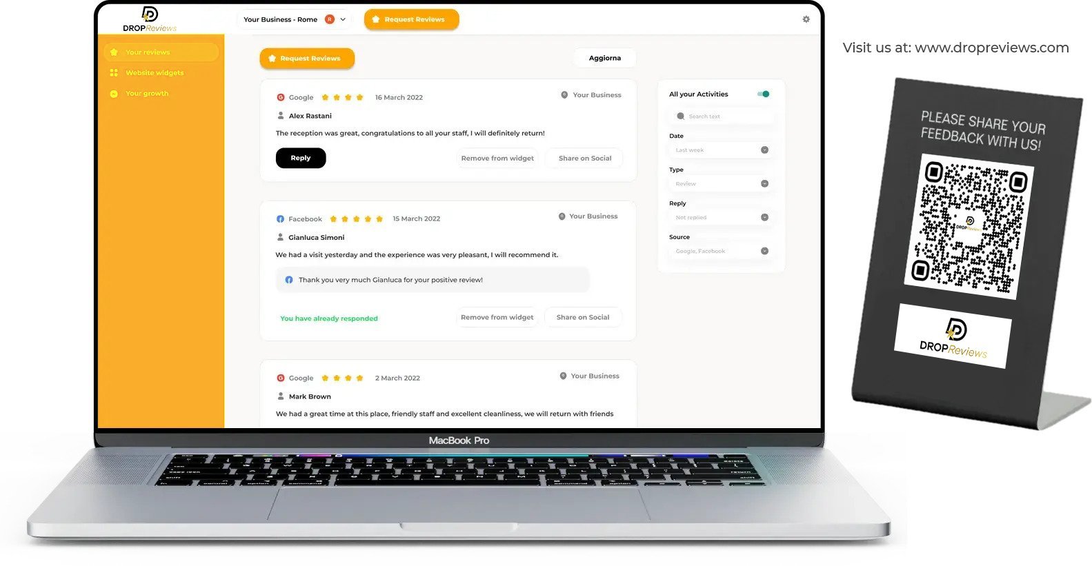 Easily view, respond to, and manage all of your business' online reviews in one place and take control of your online reputation.